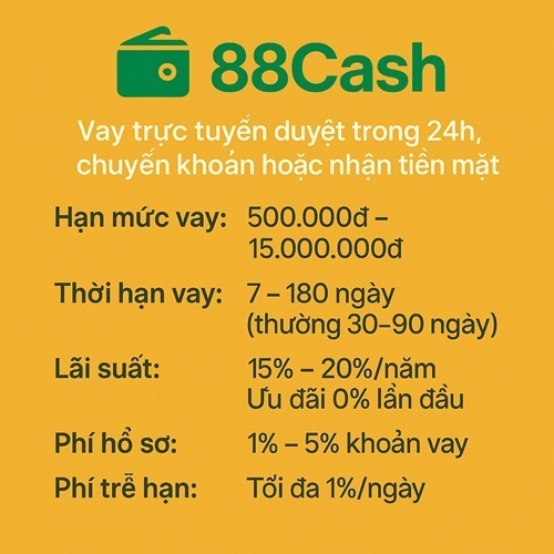88Cash là nền tảng cho vay trực tuyến cung cấp các khoản vay tín chấp không cần tài sản đảm bảo, với quy trình thực hiện hoàn toàn trực tuyến. Đây là dịch vụ cho vay H5 (HTML5) cho phép người dùng dễ dàng tiếp cận thông qua trình duyệt web trên mọi thiết bị mà không cần cài đặt ứng dụng. Cash88 hoạt động dưới hình thức kết nối khách hàng với các đơn vị cho vay, cung cấp giải pháp tài chính linh hoạt và nhanh chóng cho người có nhu cầu vay vốn ngắn hạn.