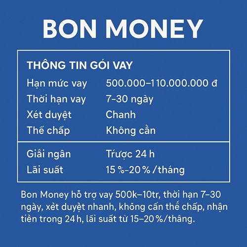 Bon Money là một lựa chọn vay H5 online cho những người cần vốn gấp trong thời gian ngắn. Tuy nhiên, với lãi suất cao và thời hạn vay ngắn, đây không phải là giải pháp tài chính dài hạn.