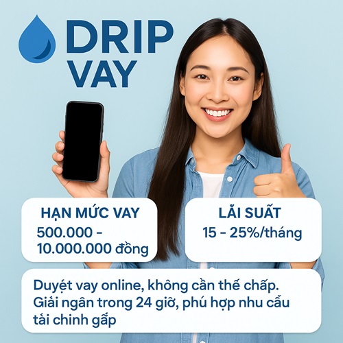 - Drip Vay: Vay đến 20tr, phù hợp người có thu nhập ổn định, lãi suất cạnh tranh.