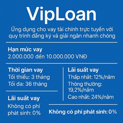 VipLoan là ứng dụng cho vay tài chính trực tuyến hoạt động tại thị trường Việt Nam, cung cấp các khoản vay tiêu dùng với quy trình đăng ký và giải ngân nhanh chóng. Ứng dụng này được thiết kế nhằm đơn giản hóa quy trình vay vốn, giúp người dùng có thể nhận được khoản vay chỉ trong vòng 25 phút sau khi hoàn tất xác minh thông tin.